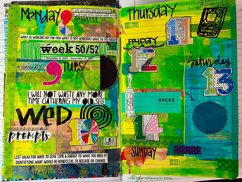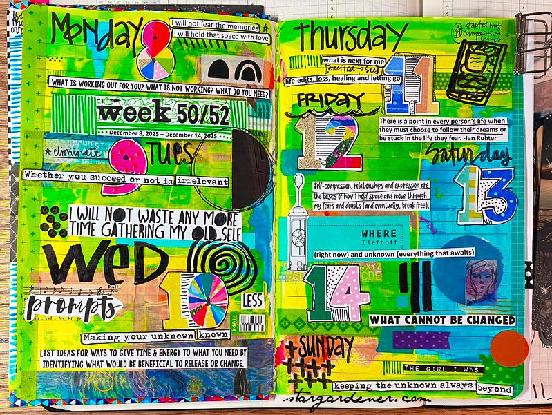 Using the December Ko-fi download as my guide I am creating a small daily collage as part of my weekly chronicle. This week I started with a painty background + a collection of phrases and quotations.